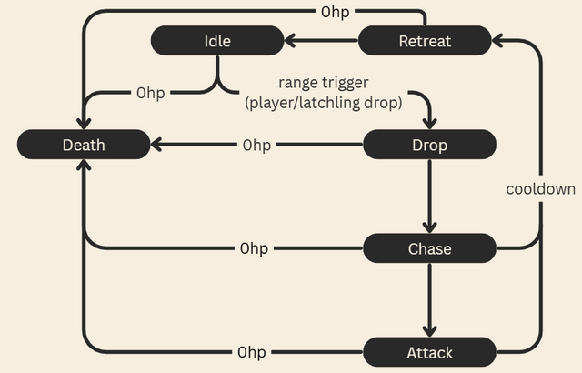 This behavior tree shows that latchlings are triggered from their idle state either by the player or by other latchlings. When they are dropped, they will chase and attack the enemy if it has not yet been defeated. If the player runs away, the latchling will eventually stop the chase and enter the retreat state, returning to its original location as quickly as possible. Even if it has already attacked and caused damage, it will still retreat. There may also be variants of this enemy that can steal currency or XP in addition to causing damage.