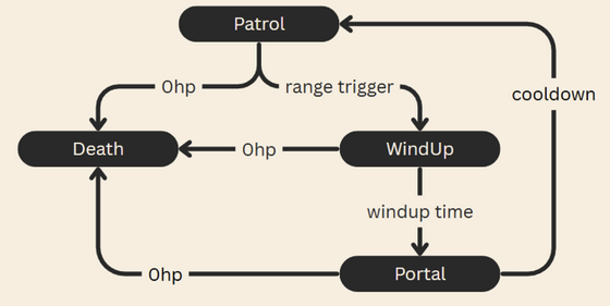 This behavior tree is fairly self-explanatory. When the player enters a certain range, the enemy charges up and, after a defined wind-up time, the portals are created. The enemy then returns to its patrol state. Overall, the enemy and its behavior are relatively basic, but the portal attack makes it quite interesting.