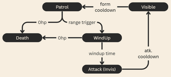 This behavior tree shows that the patrolling skirmisher is triggered by an range trigger. It then begins its wind-up and, once this is complete, becomes invisible and attacks the player. During this attack phase, it cannot be attacked. After the attack, there is a cooldown period, after which it becomes visible again and resumes patrolling.