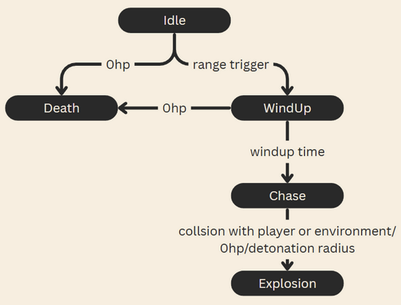 Here we see his behavior tree. He is a range-triggered enemy, when the player enters his detection radius, he begins charging. Once the charge time has elapsed, he sprints rapidly toward the player. The enemy will explode upon colliding with the player, entering a defined detonation radius, or having his HP reduced to zero. Notably, if he is killed during the wind-up phase, he dies normally and does not enter the death spiral or initiate the chase.